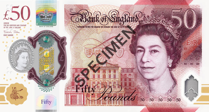 A portrait of the monarch is printed on the window with ‘£50 Bank of England’ printed twice around the edge.