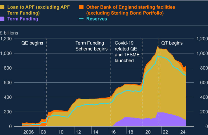 In March 2020, the Bank launched the Term Funding Scheme with additional incentives for Small- and Medium-sized Enterprises (TFSME). The TFSME was designed to help with the pass through of reductions in Bank Rate to the real economy by offering four-year funding with interest rates at, or very close to, Bank Rate. Having made £193 billion in loans, the drawdown period ended in October 2021, and the scheme is currently winding down, with most drawings maturing in 2025. Loan repayments also contribute to the reduction in the overall stock of reserves, and the overall size of the Bank’s balance sheet.