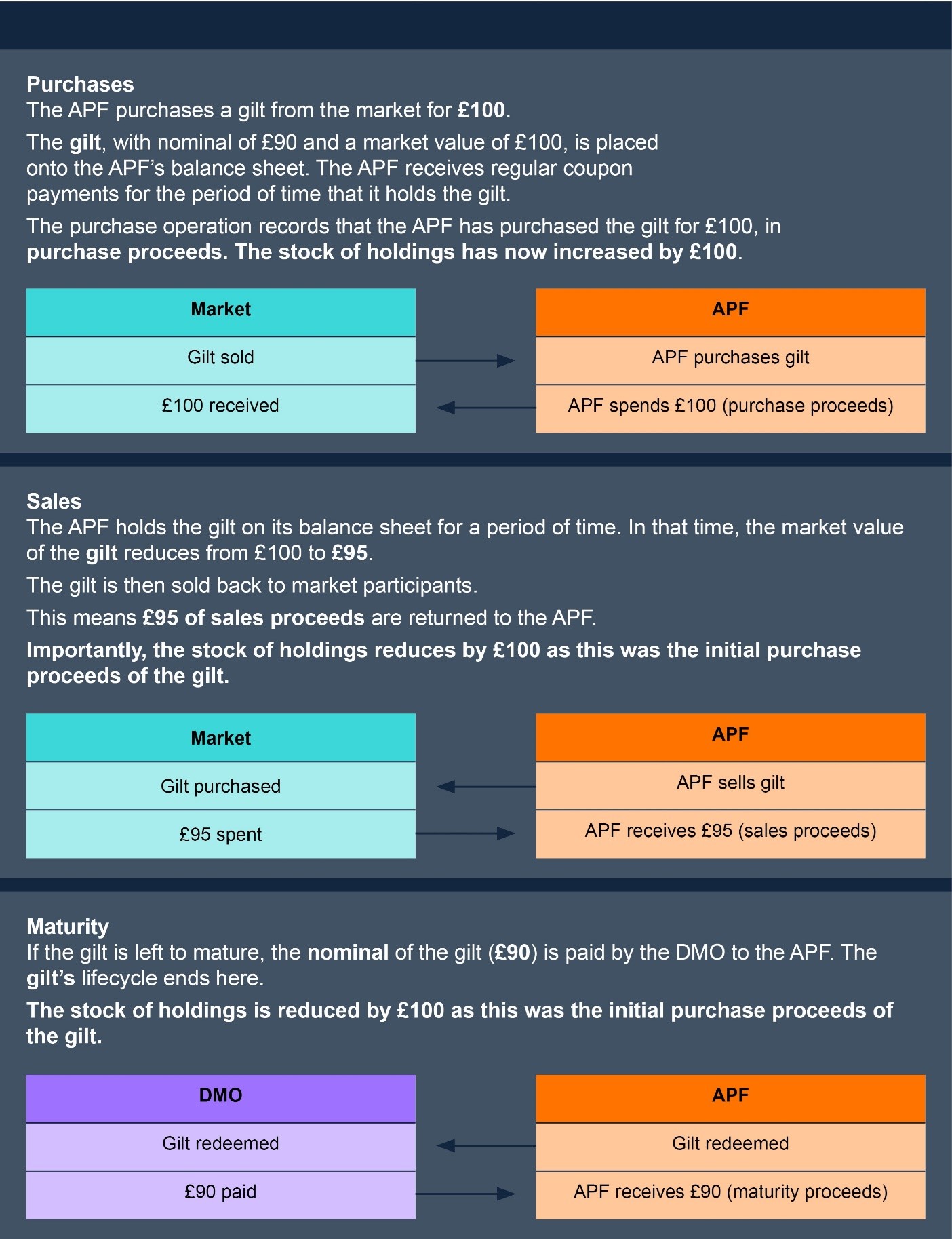 Please Note: In Diagram 1 above, the ‘maturities’ and ‘sales’ boxes reflect the initial purchase proceeds of that asset (the amount of reserves initially created to fund the purchase of the asset which is maturing or has been sold) and the stock of holdings figure will reduce by this amount. They do not reflect either the cash paid to the APF at the point of sale or upon maturity of an asset. As the size of the APF’s purchases were always measured in the amount of money used during the period of asset purchases, both sales and maturities must be measured in the same way using initial purchase proceeds.