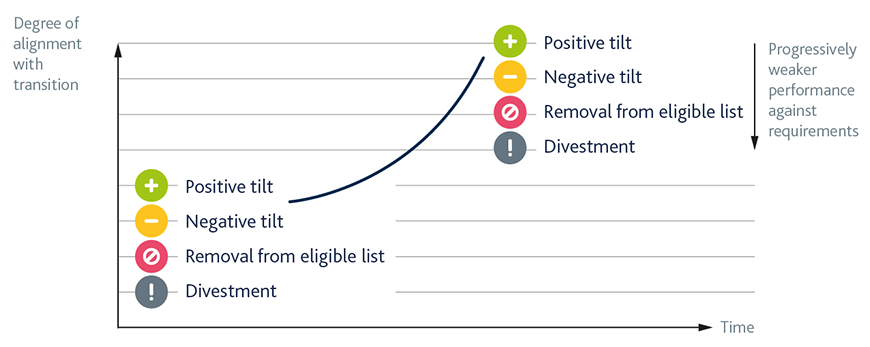 As well as progressively tightening our overall requirements, we also have an ‘escalation ladder’ of actions we can take against specific firms whose climate performance is not sufficiently strong. Figure 2.4 summarises this set of actions. These include tilting purchases away from weaker climate performers, making them ineligible for further purchases and, if appropriate, divestment of existing holdings of their debt. The upward sloping line represents our overall requirements becoming more demanding over time.