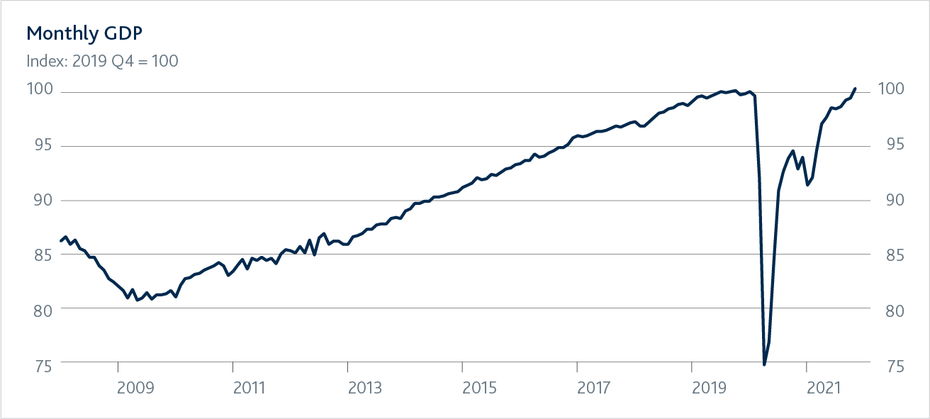 The UK economy continues to recover. In November last year, economic activity was back to where it was before the pandemic. Since then, the spread of Omicron meant people spent less. But as the number of new cases falls, we expect spending to go up again.
