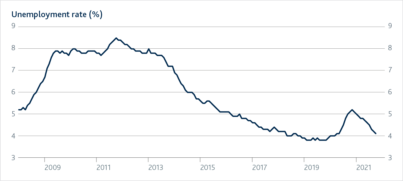 The number of people out of work has fallen. The unemployment rate is only slightly higher now than it was before Covid.