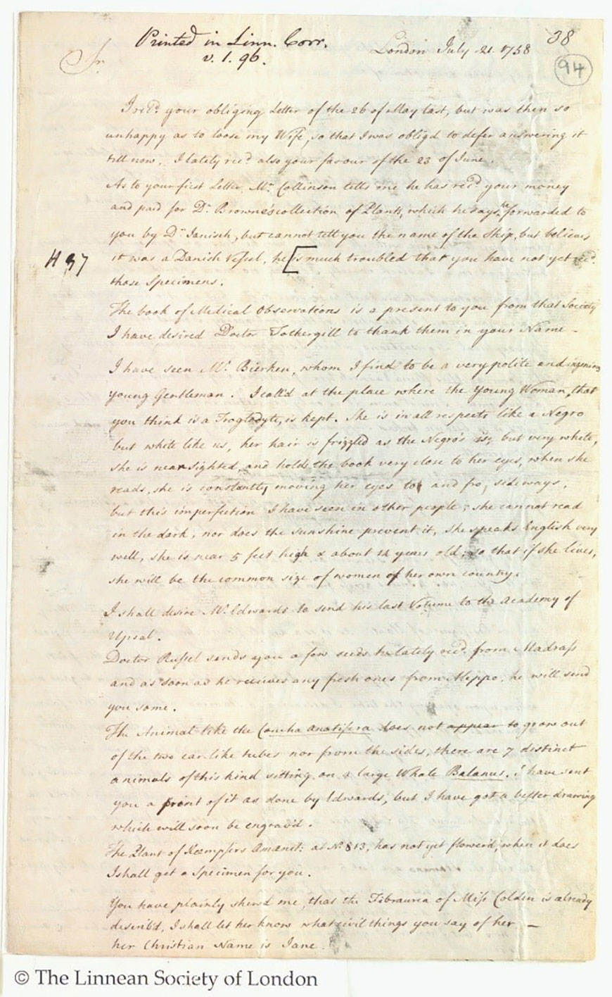 The letters kept at the Linnean Society shed light on how, as an albino, she puzzled 18th century scientists all across Europe. From other sources, we know that Amelia Newsham eventually took her destiny into her own hands, turned the European curiosity for the unusual and exotic to her advantage, and became a shrewd businesswoman, a wife and a mother.