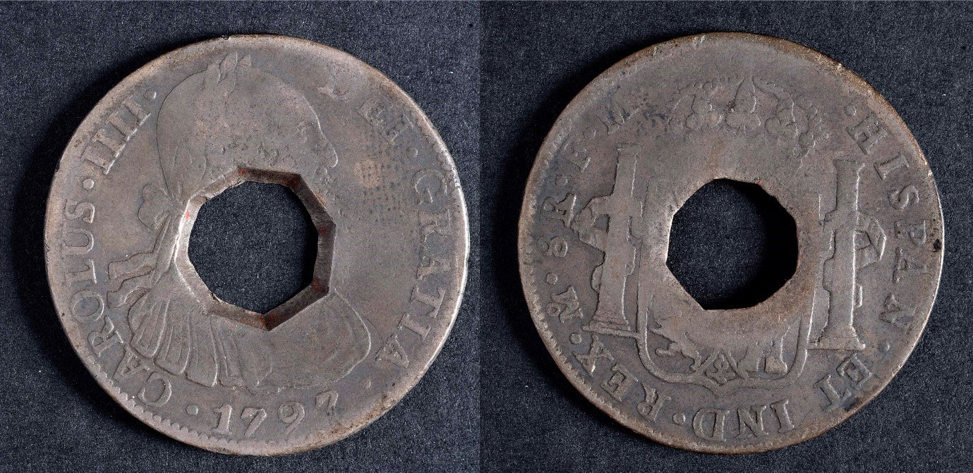 Transatlantic slavery and the slave trade supported British colonialism, expanding Britain’s trade links as well as its power and influence by seizing control of other countries. Part of Britain’s colonial rule in places like the Caribbean was introducing British currency. But making new coins was expensive and time consuming. To speed up the process, existing coins from one country could be made into legal currency in another by adding a stamp mark in a process called countermarking. Coins were stamped with special marks to make them a valid form of currency in different Caribbean countries. Most of these coins are Spanish 8 reales, also known as silver dollars or pieces of eight. These were minted in huge quantities in Spanish colonies in the Americas, and were an important trading currency during this period.