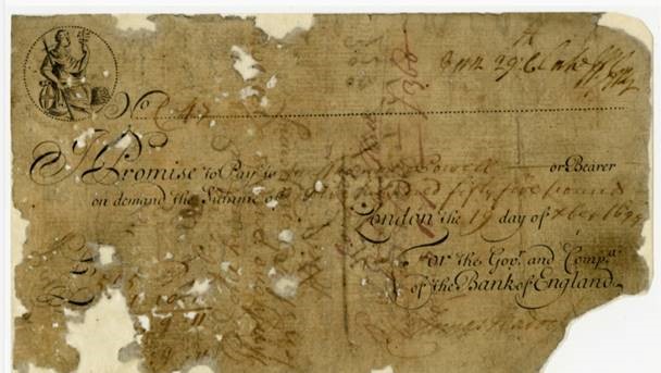 Banknote with early version of Britannia, dated 19 December 1699. Museum Reference: I/005.