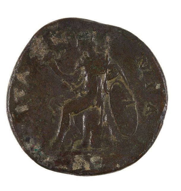 Brass sestertius coin, 140-144 AD. Museum Reference: A405