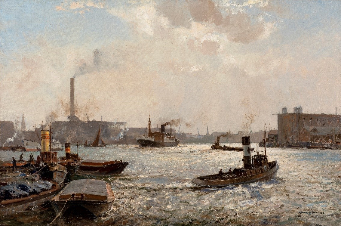 Visitors to Rotherhithe, whether they are motivated museum goers, Rotherhithe residents or just passing through via the Thames Path, can now get a glimpse of what this area looked like over 75 years ago. Outside the Brunel Museum on an unprepossessing planter is a reproduction of Arthur Burgess’ ‘Lower Thames and Limehouse’. The oil painting shows dock workers bobbing along the Thames shifting precious cargo during the Second World War.