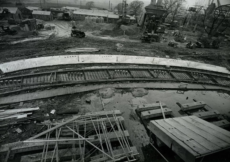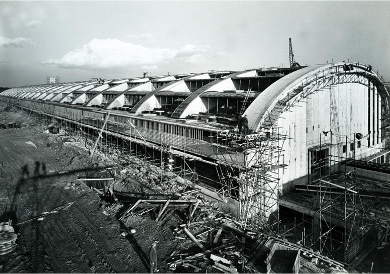 The reinforced concrete roof arches of the main production hall were cast in pieces on site, and then lifted into place.